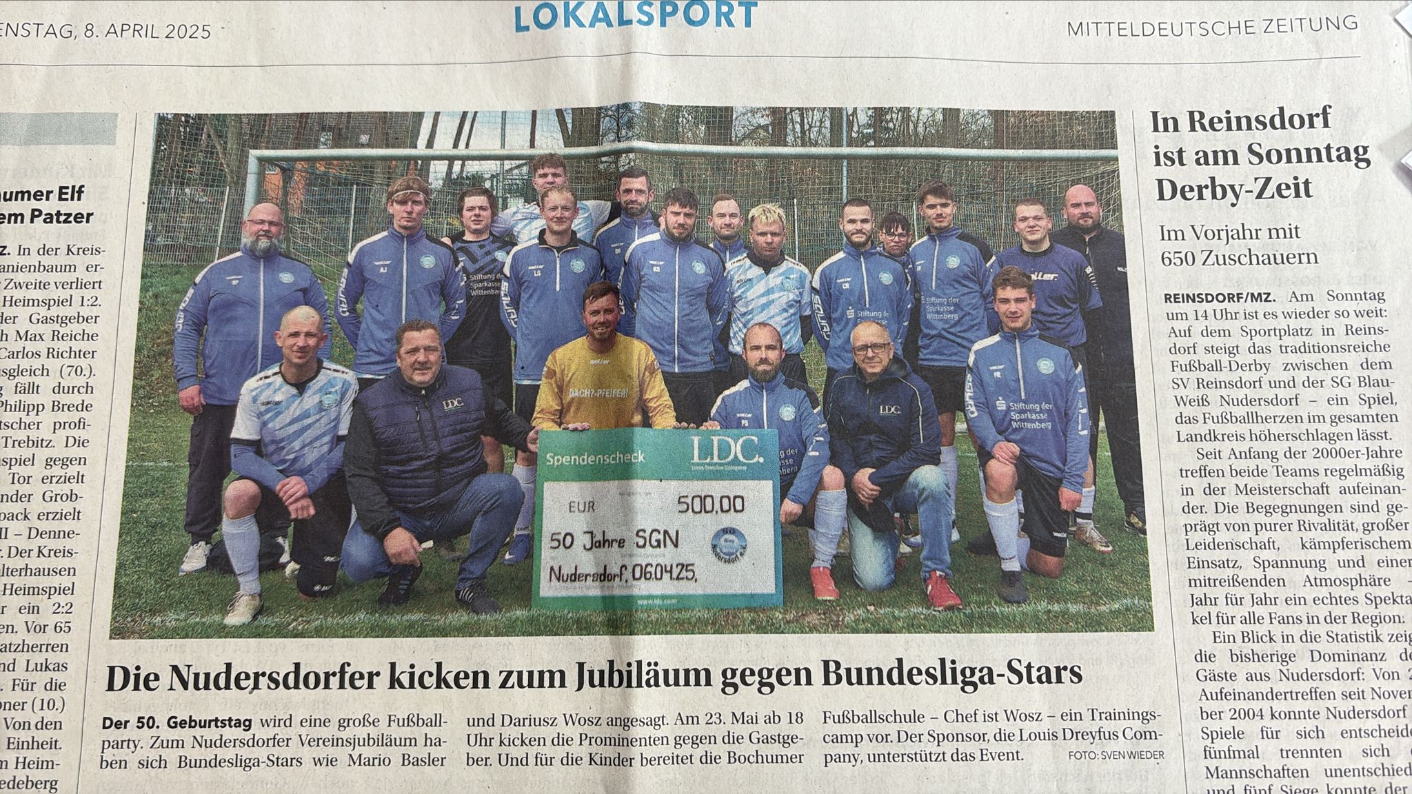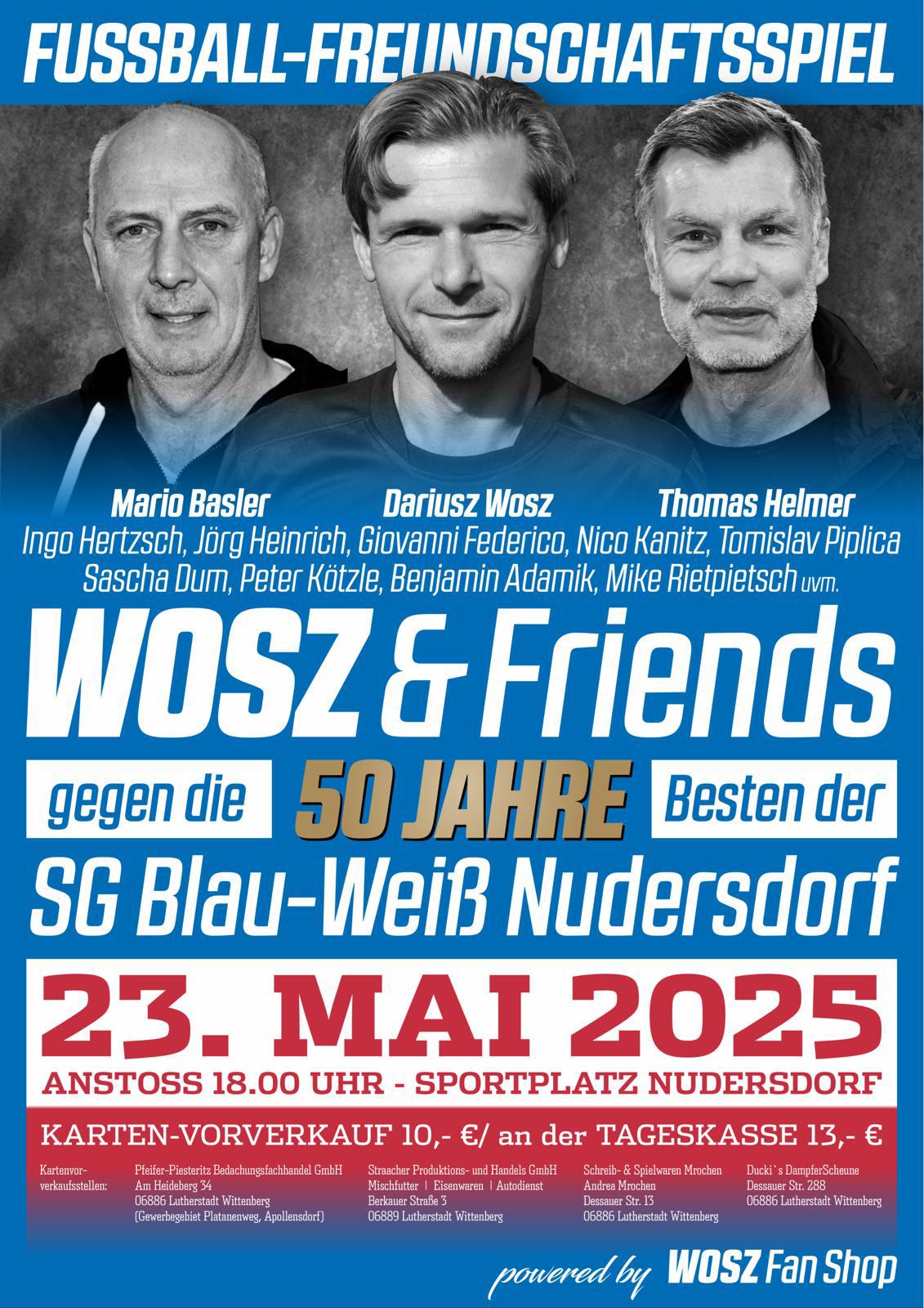 Vom 23.-25. Mai fand das 50. Vereinsjubiläum der SG Blau-Weiß Nudersdorf in Wittenberg statt. Highlight des Jubiläums war ein Spiel der Männermannschaft der SGN gegen das Team Wosz & Friends, bei dem u.a. ehemalige Nationalspieler wie Dariusz Wosz, Mario Basler, Thomas Helmer, David Odonkor oder Jörg Heinrich mitwirkten.